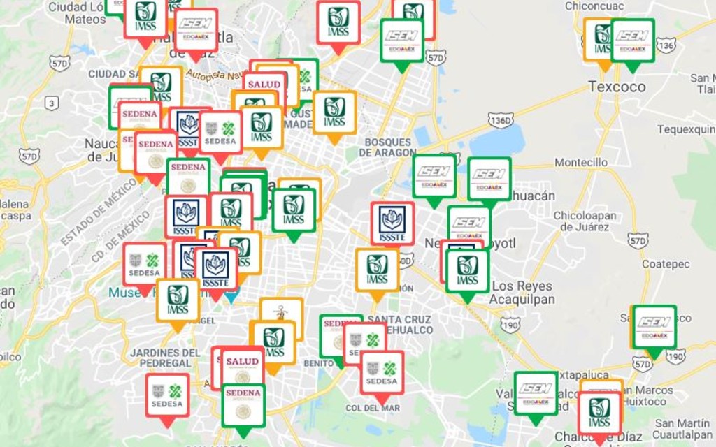 El pasado sábado, el mapa que muestra la ocupación hospitalaria en el Valle de México mostraba que 26 hospitales lucían en color rojo, con la especificación “hospital sin disponibilidad”.