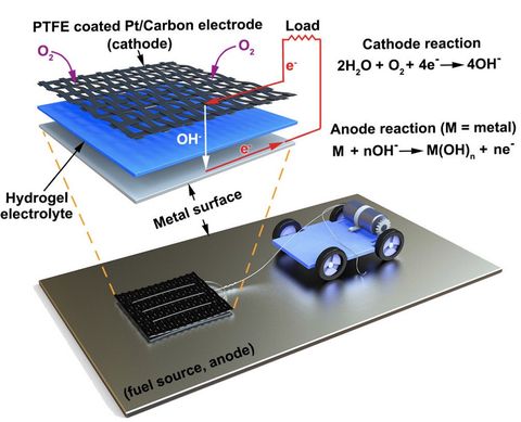 Entre la película de carbono y la superficie metálica en cuestión, un hidrogel similar a Jello, cargado de agua salada, actúa como un electrolito, llevando a cabo electrones entre el metal y el cátodo. De esa manera, cuando el hidrogel toca una superficie metálica, esa zona actúa como el ánodo de una batería, dejando pasar los electrones al cátodo, que luego alimenta el dispositivo.