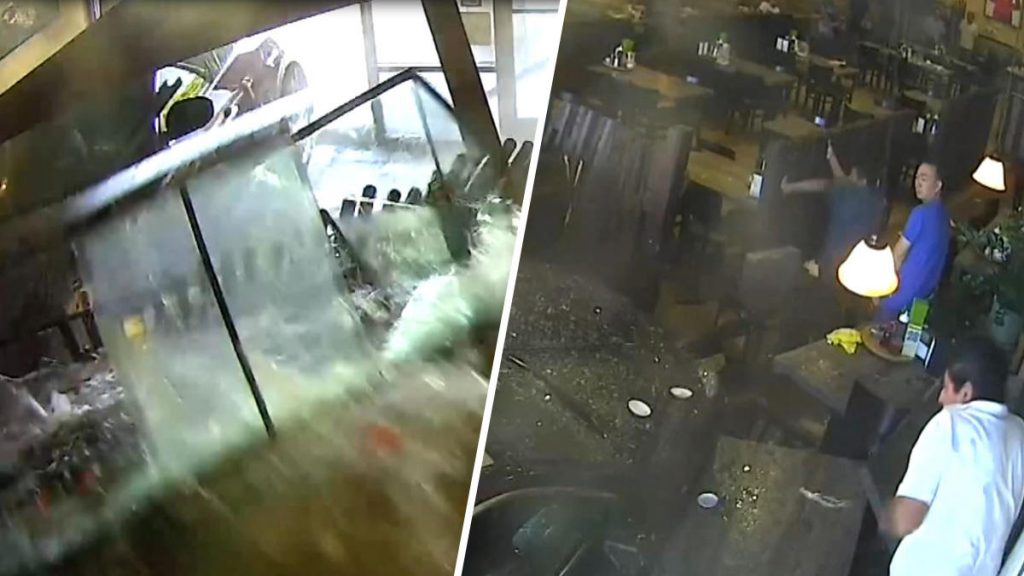 Un video de vigilancia muestra momentos en que la conductora del vehículo pierde el control de su auto y acaba dentro del restaurante vietnamita “Pho 7 Cow”, atropellando comensales a su paso y matando a docenas de peces que nadaban en un acuario.