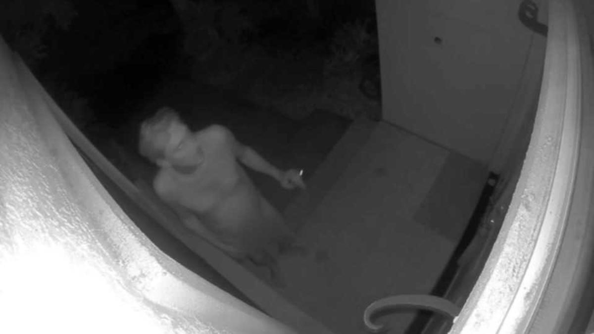 En las imágenes de video se puede ver al sospechoso caminado desnudo por la cuadra 3600 de Meadowlands cuando se acerca a una vivienda, toca la puerta, fisgonea por las ventanas y posteriormente huye de la escena.