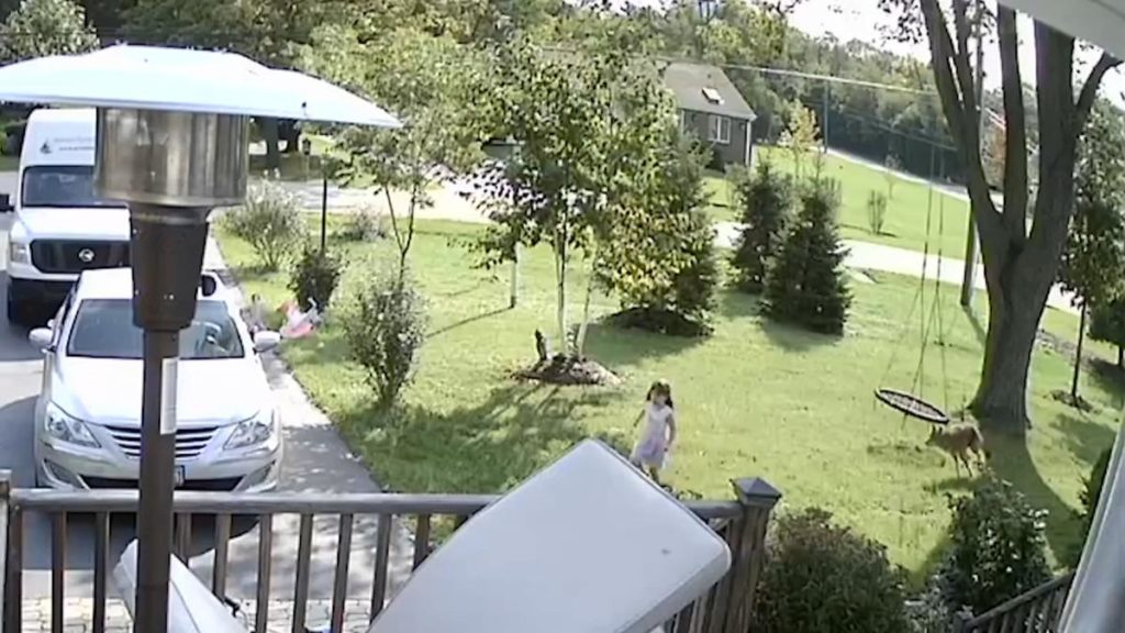 En las imágenes se ve a un coyote corriendo sobre el césped, justo cuando la niña intentaba subirse a un columpio atado a un árbol.