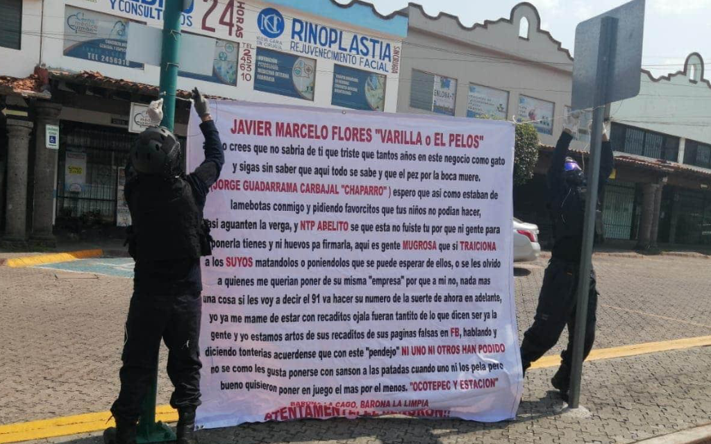 Elementos de la Policía Morelos de Mando Coordinado solo lograron retirar las narcomantas minutos después.