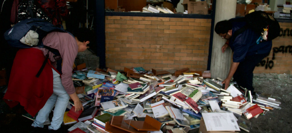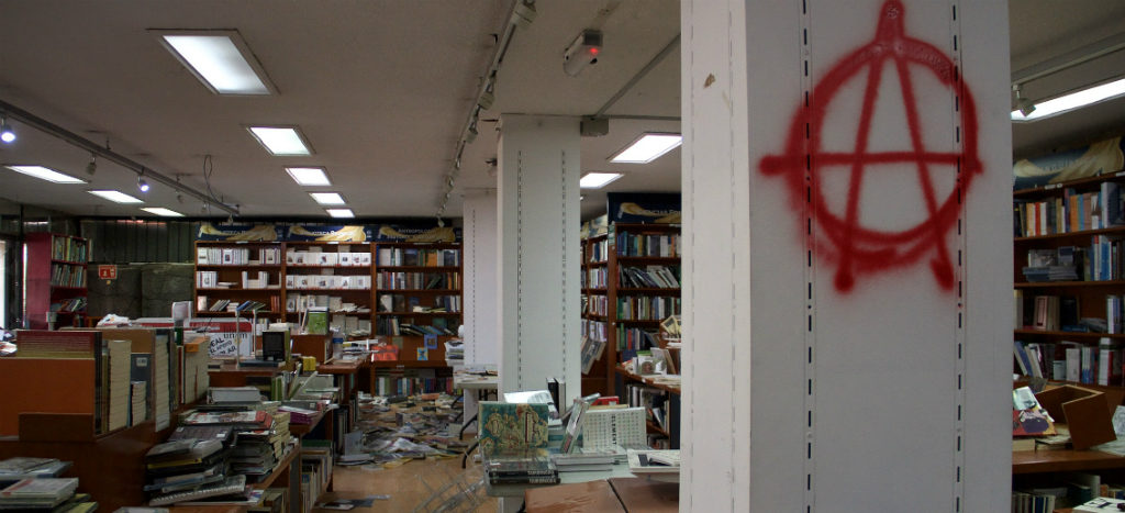 “Los vándalos, quienes se dicen anarquistas, arremetieron contra puertas y ventanas, y prendieron fuego en la planta baja del inmueble. También causaron destrozos y saqueos en la librería Henrique González Casanova, ubicada al costado sur de la Torre”, indicó.
