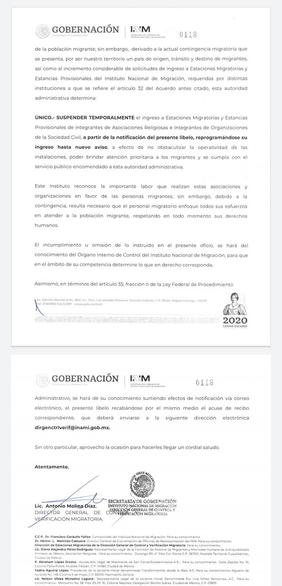 La Secretaría de Gobernación informa que desconoce el oficio INM/DGCVM/0118/2020 emitido el día de hoy por el Lic. Antonio Molina Diaz, sin contar con la autorización de las autoridades superiores.