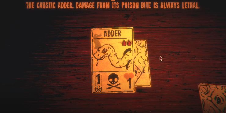 El veneno de la víbora le da el sello Toque de la muerte, que mata a cualquier enemigo al que ataque independientemente de su salud después de recibir el golpe. Sin embargo, el veneno de esta serpiente tiene otro uso. La habilidad oculta de Adder matará a los supervivientes hambrientos apiñados alrededor de fogatas en todo el tablero de juego. Al encenderlo en estas fogatas hasta que los sobrevivientes se lo coman, los jugadores pueden desbloquear la capacidad de aumentar la salud de sus cartas y el poder de ataque sin riesgos durante el resto del juego.