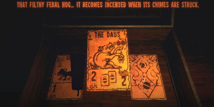 Uno de Cifrado Las cartas más misteriosas son The Daus, que hace referencia a la carta The Daus de un antiguo juego de cartas europeo conocido como Karnoffel. Si bien esto puede no parecer nada especial a los jugadores durante su primer juego, el Código Karnoffel se menciona varias veces a lo largo del juego y se relaciona con los secretos de OLD_DATA y sus horrores ocultos. El propio Daus crea campanillas 0/1 en espacios adyacentes del tablero cuando se juega, y su habilidad oculta le permite atacar a cualquier criatura que ataque estas campanas.