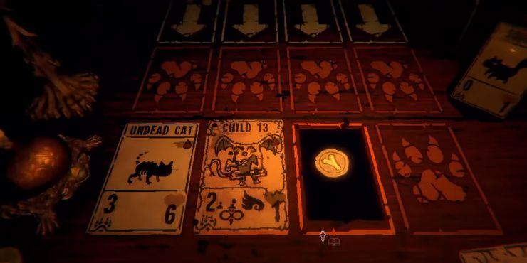 Como referencia al niño hambriento en Cifrado Versión de demostración, Deben hacerse sacrificiosEl Niño 13 es una de las cartas raras más singulares que los jugadores pueden agregar a su mazo en el Acto 1. El Niño 13 tiene un modo de “defensa” durmiente y un modo de “ataque” volador que cambia de un lado a otro cada vez que se sacrifica. Su sigilo Many Lives lo mantiene en el tablero, pero, una vez que haya sido sacrificado 13 veces, se transformará en un Hungry Child 0/1 sin habilidades, ni siquiera ocultas. Sin embargo, se transformará de nuevo en Child 13 para la próxima batalla.