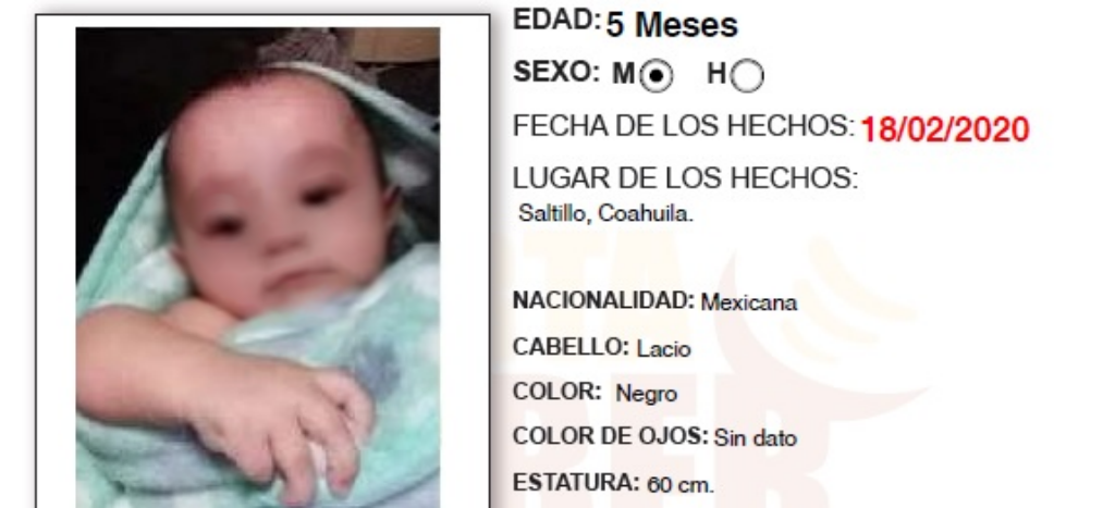 El cuerpo de Karol Nahomi, bebé de cinco meses reportada como desaparecida este martes, fue hallado sin vida en un terreno baldío en Saltillo, Coahuila, informó la Fiscalía General de esa entidad.
