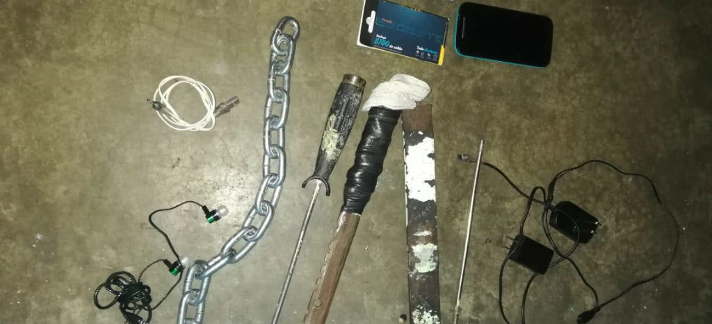 Jorge Israel Ponce de León, coordinador de Reinserción Social, dio a conocer que resultado de las acciones efectuadas a cargo del personal de custodia, se logró asegurar en distintas zonas, un total de 11 equipos de telefonía celular, siete puntas hechizas, un cuchillo, una cuerda y una cadena metálica, objetos que fueron fijados y marcados de acuerdo a las áreas aseguradas, a fin de que el área jurídica establezca el procedimiento legal para la entrega de los artículos y el seguimiento de cada caso ante la Fiscalía General del Estado.