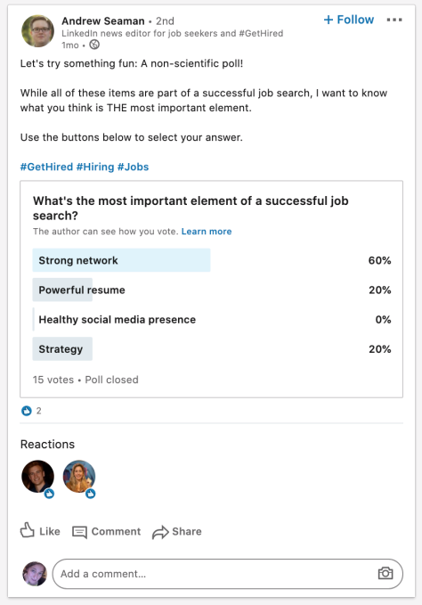 La función de encuestas (puede ver un ejemplo de una en la imagen a continuación, o responder a esa encuesta específica aquí) es una forma rápida y poco estricta de hacer una pregunta y fomentar el compromiso: LinkedIn dice que una encuesta solo toma alrededor de 30 segundos para armar, y responder no requiere pensar en algo para escribir, pero le da al entrevistado más de una “voz” de la que él o ella obtendría simplemente al proporcionar un “me gusta” u otra reacción.