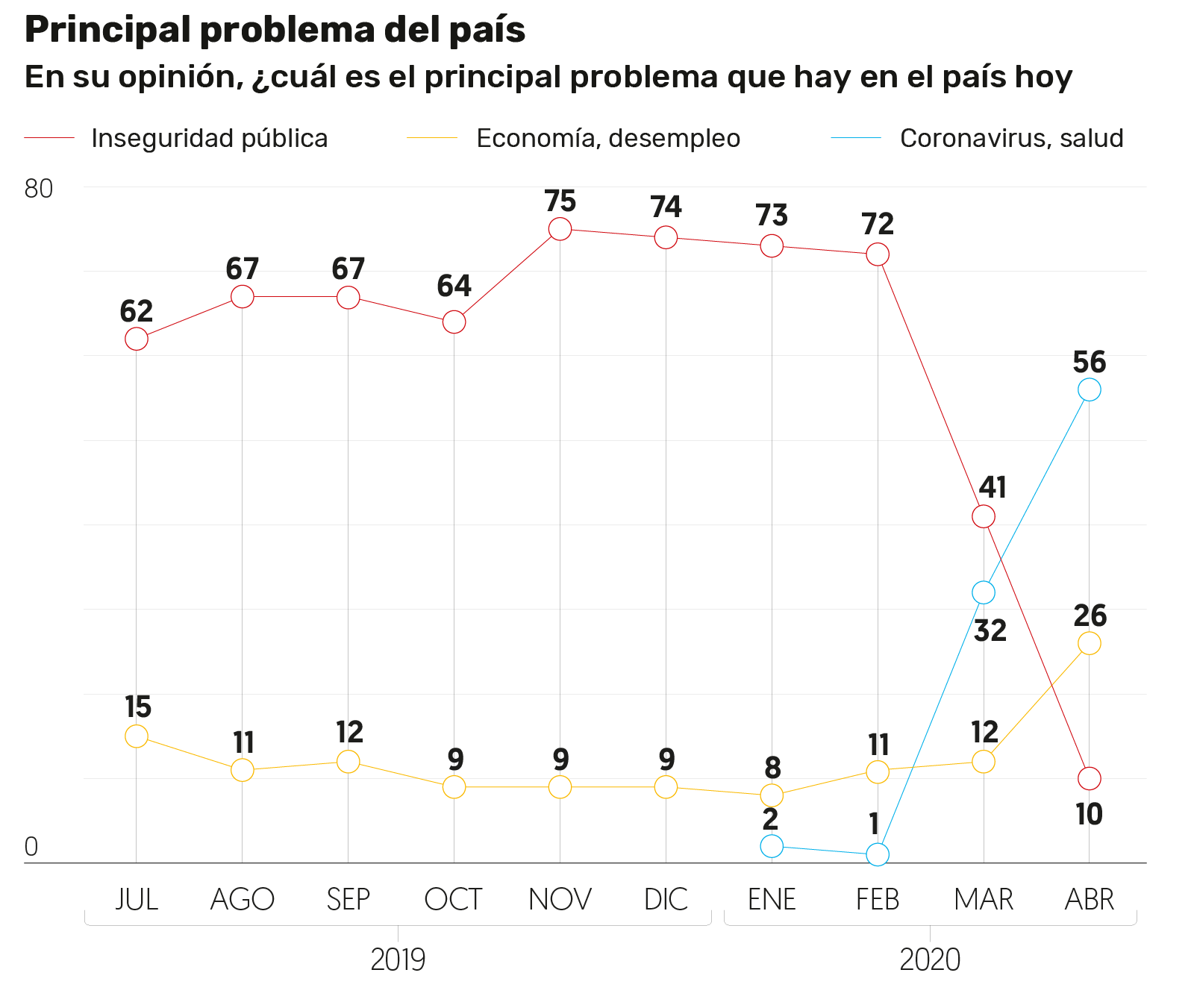 De acuerdo con la encuesta de Moreno, la economía superó a la inseguridad pública como segundo problema principal que el país enfrenta actualmente, al crecer de 12 a 26 por ciento, entre marzo y abril.