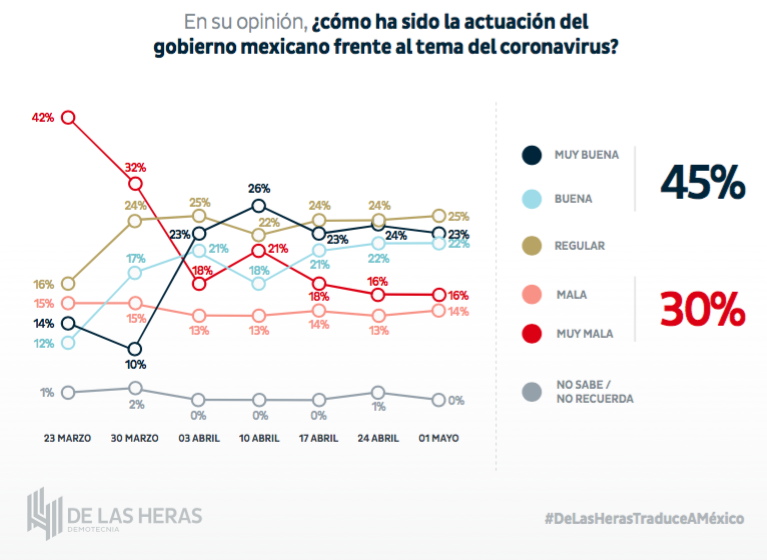 Además, su encuesta revela “una percepción positiva a la manera como el gobierno ha tratado con la crisis sanitaria, con un 53 por ciento que expresa una opinión favorable sobre el desempeño del gobierno en salud, frente a 29 por ciento que expresa una opinión desfavorable. El mes pasado, el desempeño en salud contaba con 28 por ciento de opinión favorable y una mayoría de 54 por ciento con opinión negativa. Esta tendencia al alza, sugiere que en abril sí hubo un efecto rally de apoyo al primer mandatario ante la amenaza de la pandemia”.