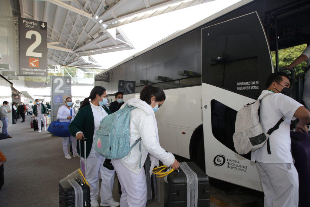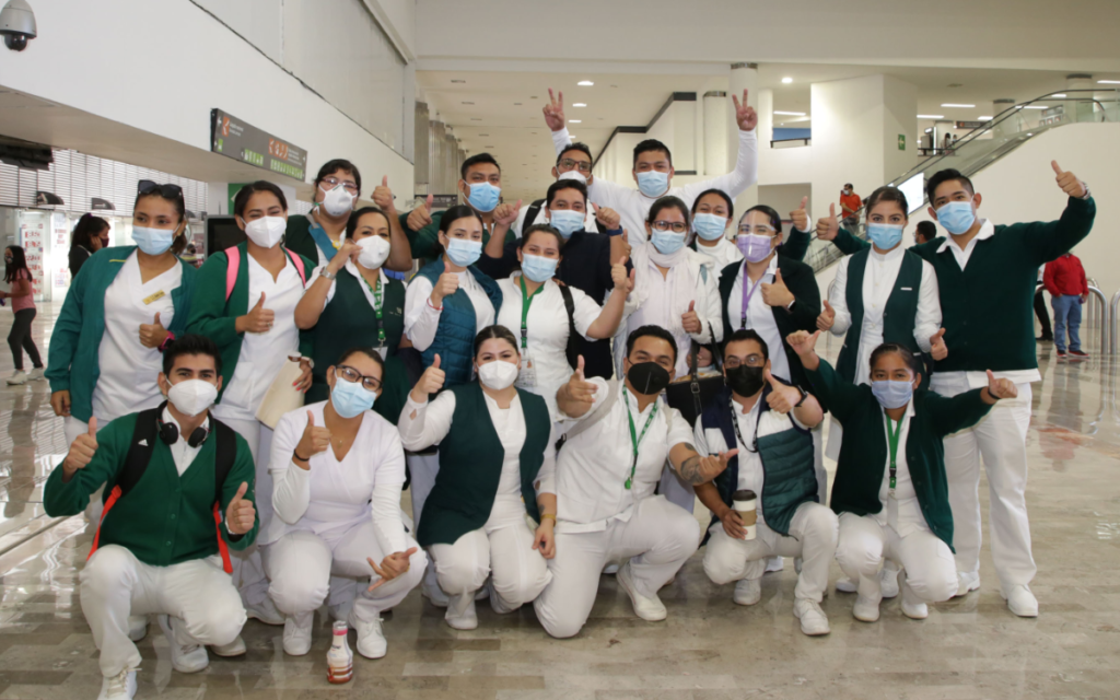Las enfermeras y los enfermeros laboran en el Hospital General de Zona (HGZ) No. 46 de Villahermosa, Tabasco. A su llegada al Aeropuerto Internacional de la Ciudad de México (AICM) expresaron que parte de su motivación para estar en la capital del país es la gratitud y reciprocidad que han recibido de otras entidades cuando su estado ha registrado inundaciones u otros desastres naturales.