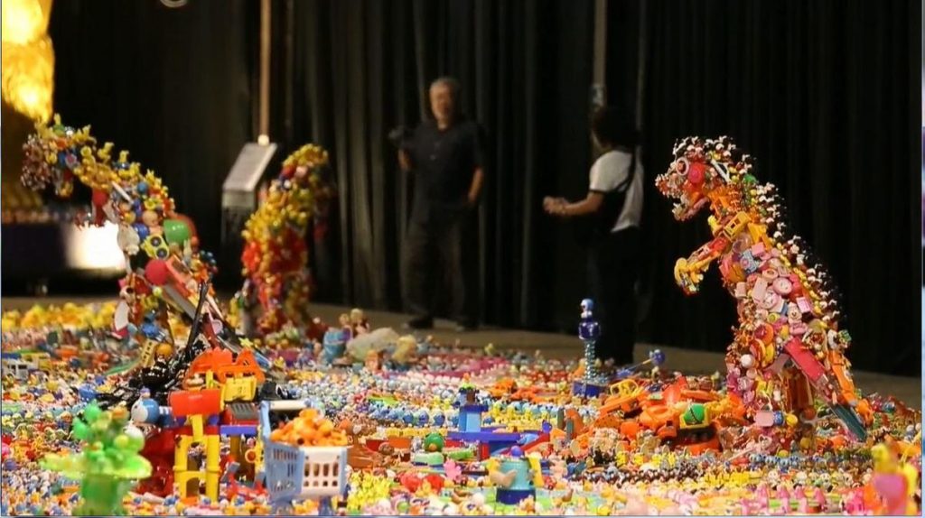 Bangkok, Tailandia.- Con más de 30,000 juguetes y piezas desechadas, el artista japonés Hiroshi Fuji ha creado un parque jurásico multicolor que se expone en Bangkok para concienciar sobre la invasión del plástico desde nuestros primeros años de vida.