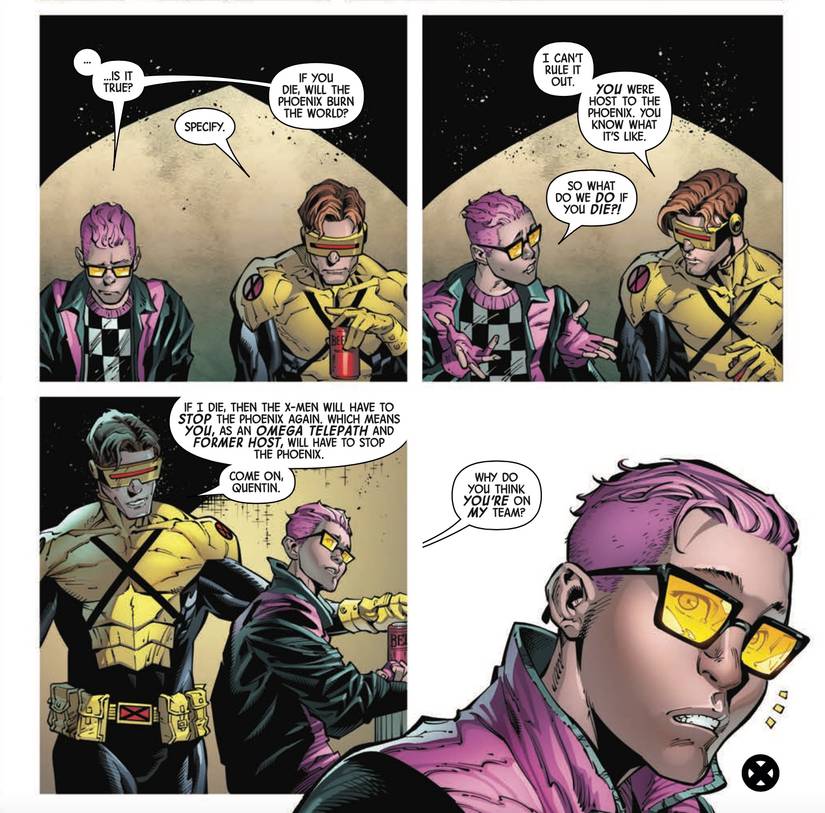 Quentin Quire le pregunta a Cyclops cuáles son sus planes si esto sucede, y Scott revela que él, Kid Omega, es parte de su plan de contingencia.
