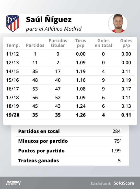 Además, el ilicitano se ha convertido estos años en una suerte de talismán para el Atlético. Si marca, el equipo casi siempre gana, o por lo menos no pierde. En los 37 goles que ha hecho Saúl con el primer equipo del Atlético de Madrid, 33 victorias y cinco empates.
