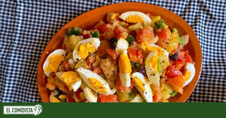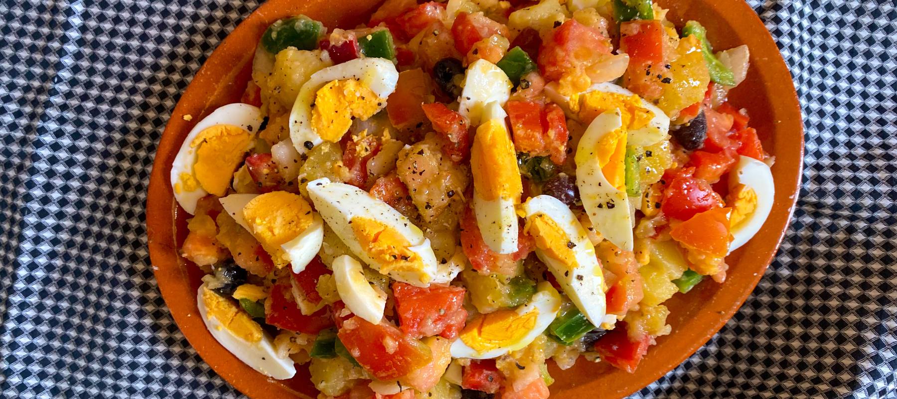 Ensalada campera, ensalada española, de verano o de patata: diferentes nombres que nos llevan a un mismo plato preparado con una base de patata cocida con hortalizas, un aliño generoso a base de aceite y vinagre y alguna proteína de buena calidad para rematar (normalmente huevos, algún pescado en conserva o una combinación de ambas cosas).