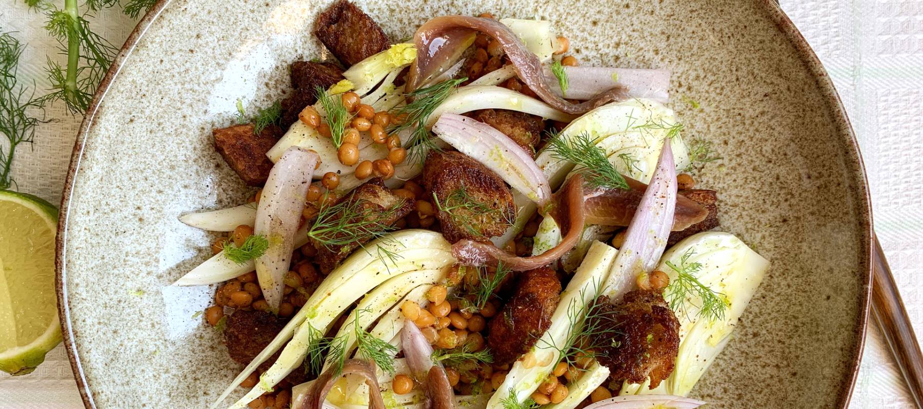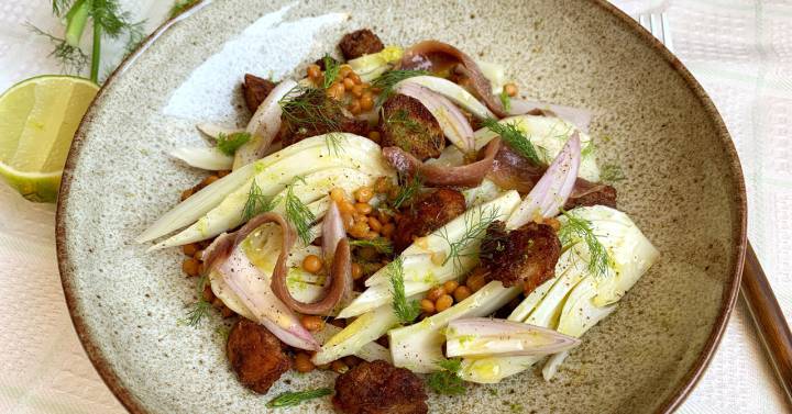 El hinojo tiene un aroma y un sabor muy característicos que combinan genial tanto con las lentejas en frío como en un potaje. Si lo combinamos con unos picatostes hechos a la sartén, con mantequilla en la que previamente hayamos deshecho unas anchoas, obtendremos un plato salado, aromático y con muchas texturas. Para rematar la sencillez, lo aliñaremos con algo tan básico como zumo de limón, aceite de oliva, sal y pimienta negra, para así obtener el toque cítrico y ligeramente picante que nos falta para completar (y, de paso, haremos feliz a Pipo).