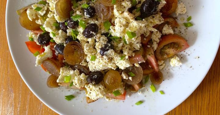 - Cortar los tomates -a temperatura ambiente- a lo largo, quitarles el pedúnculo, cortarlos en gajos que quepan bien en la boca y ponerlos en una fuente o un bol. Cubrir con el queso desmigado con las manos -está bien que queden trozos de diferentes tamaños- y con el ajo tierno, verde del puerro o cebollino picados (o la cebolla en pluma fina).
