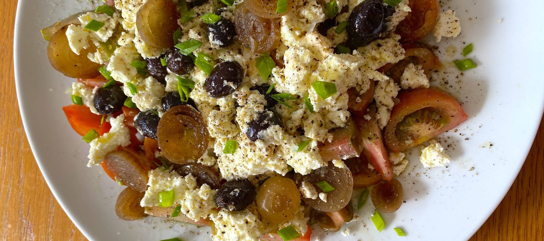 Como los tomates ya tienen un punto de acidez y dulzura, y las cebollitas también aportan ambas cosas, para mí la ensalada solo necesita un buen chorro de aceite, sal y pimienta para estar perfectamente aliñada. Puedes rematarla -y muchos otros platos, como cremas de verduras, estofados o guisos de legumbres- con la parte verde de cebolleta, puerro o ajos tiernos picados o en rodajitas. En el caso del ajo conseguiremos una especie de “ajollino” -espero que la Fundéu reconozca mi mérito-, con un sabor mucho más suave, fresco y herbáceo, además de una digestión muchísimo más sencilla que la de esta liliácea cruda.