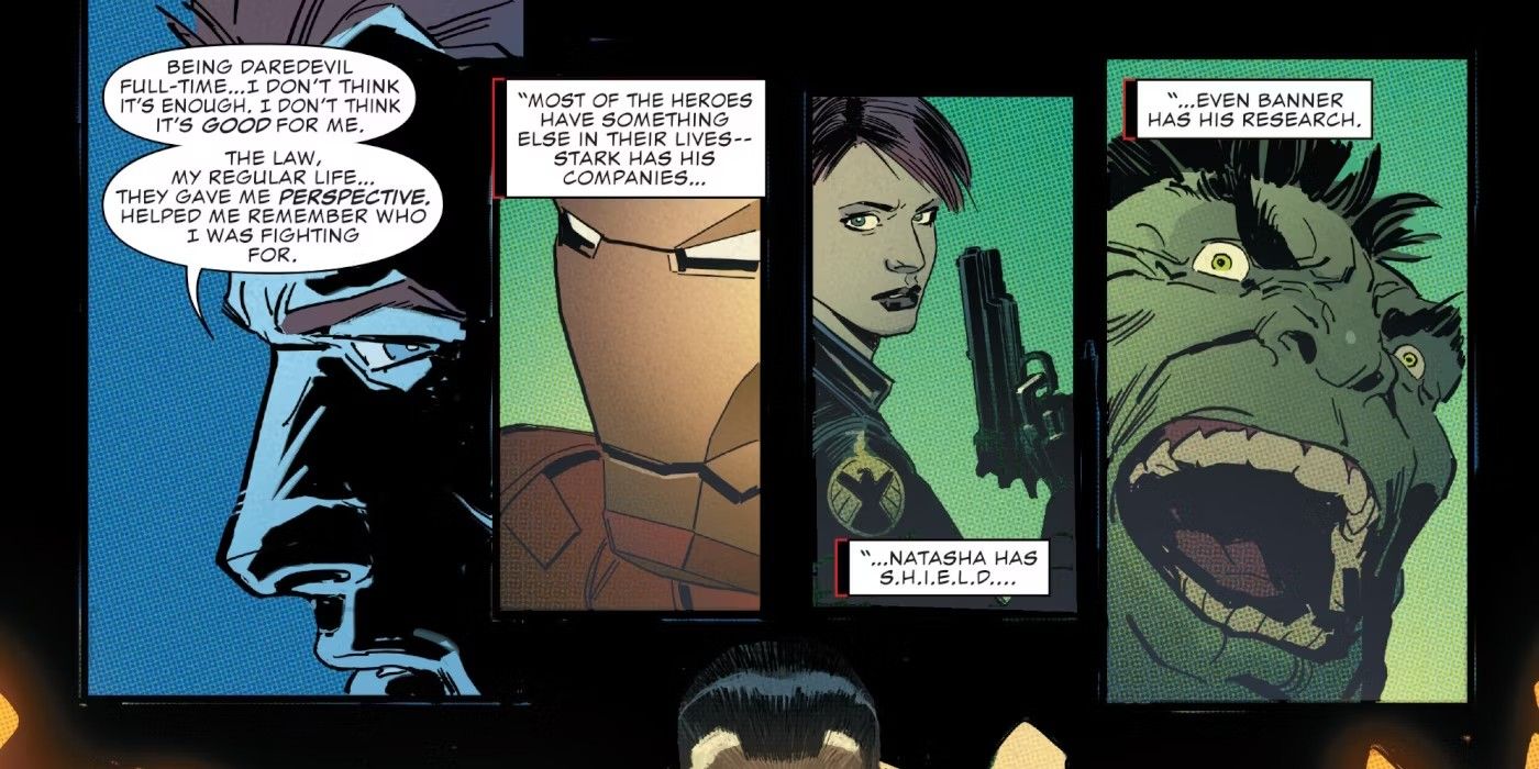 - Daredevil se da cuenta de la importancia de las identidades secretas para la salud mental y utiliza a Punisher como ejemplo.