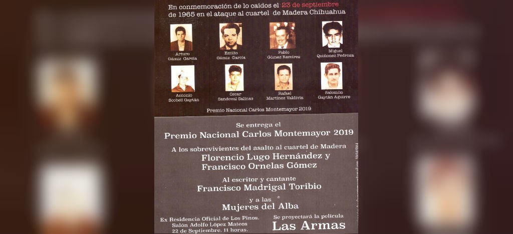 Desde la ex residencia oficial de Los Pinos, el domingo 22 de septiembre será entregado el Premio Nacional Carlos Montemayor a Florencio Lugo Hernández y Francisco Ornelas, sobrevivientes del asalto al cuartel de Ciudad Madera, Chihuahua, el 23 de septiembre de 1965.