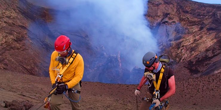 Erik Weihenmayer: Bueno, hice mi investigación. Me preparo para estas experiencias. Pero quiero decir, como un amante de la naturaleza, se traduce de alguna manera, ¿verdad? A pesar de que nunca he hecho rappel en un volcán activo, sé cómo evaluar el riesgo y mantener entre comillas, mis ojos bien abiertos para evaluar el riesgo constantemente. Sabes, ¿es esta una situación que debo adivinar o debo confiar en el equipo? Tenían un muy buen equipo de expertos con nosotros. Como las Fuerzas Especiales y las personas con experiencia en actividades al aire libre que observaban el cambio de viento. [because] si el viento sopla hacia ti y envía esas bombas de magma hacia ti, lárgate de allí. Estarán mirando los humos, el gas para que todos pongan [their] respiradores encendidos.