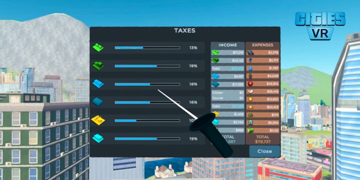 En Ciudades: RV, los jugadores pueden optar por obtener una verdadera vista aérea sobrevolando su ciudad, o pueden optar por verla crecer a su alrededor desde la nueva opción de Street View. Muchas de las características favoritas de Ciudades: horizontes se han incluido en la adaptación de realidad virtual, aunque actualmente no es posible expandir la ciudad más allá del cuadrado único que los jugadores seleccionan al comienzo del juego. El alcance más pequeño limita un poco la capacidad de hacer crecer una población masiva, pero más allá de eso, la recreación se mantiene en gran medida fiel a la serie original y permite a los jugadores diseñar su ciudad ideal y experimentar su crecimiento mientras sienten que son realmente parte del mundo.