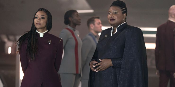 Olatunde Osunsanmi: Sí, también fue una sorpresa para mí cuando me enteré. Ella siempre ha sido una gran admiradora del programa. [Executive producers] Alex [Kurtzman] y michelle [Paradise] fueron empujados por Wilson Cruz, quien dijo: “¿Te gustaría tener una charla con Stacey?” Dijeron: “¡Claro!” Así que se subieron [a call] con ella, y Alex y Michelle lanzaron esta idea de “¿Te importaría venir al programa?” Ella dijo que sí, que le encantaría. Descubrieron en qué personaje deslizarla[to] y terminó siendo el presidente. Entonces, una vez que nos enteramos de ese casting, fue toda una sorpresa.