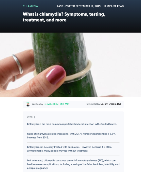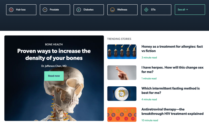 En la Guía de salud puede buscar afecciones específicas, buscar categorías como diabetes o pérdida de cabello y buscar artículos destacados como “Formas comprobadas de aumentar la densidad de sus huesos” o “Cómo se hace la prueba de gonorrea”. No hay anuncios publicitarios, por lo que su búsqueda sobre la gripe o la testosterona no lo llevará inmediatamente a ser bombardeado con promociones para Mucinex o suplementos peligrosos. “En estos otros sitios. . tienes [advertisers] con suplementos y servicios no regulados que son el mejor postor además de la información médica, lo que genera mucha desconfianza “.