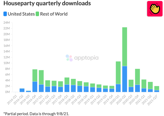 Según los datos de Apptopia, Houseparty ha ido disminuyendo continuamente desde el brote de la pandemia. Hasta la fecha, su aplicación ha tenido un total de 111 millones de descargas en iOS y Android, la mayoría (63 millones) en iOS. Estados Unidos fue el mercado más grande de Houseparty, representando el 43,4% de las descargas, seguido por el Reino Unido (9,8%) y luego Alemania (5,6%).