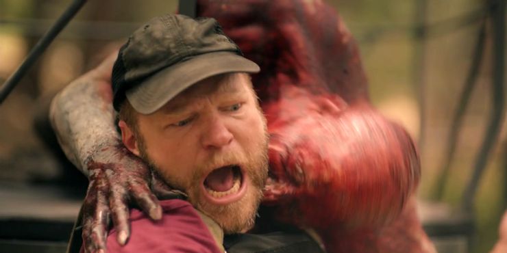 El drama de “Feral” comienza a entrar realmente en juego cuando el cazador Bob Birch encuentra a Jay Gantz y le dice que sabe lo que le sucedió a su hijo. Bob Birch viene originalmente a la casa de Jay y le muestra una foto de la cámara del parque de un joven adolescente que fácilmente podría ser Jacob. Birch luego le dice a Jay que cree que Jacob fue secuestrado por un grupo de cultivadores ilegales de marihuana que viven en el bosque y que también incursionan en la trata de personas, y le explica que llevará a Jay a su ubicación por un precio. Después de llevar a Jay y Addy al Historias de terror estadounidenses Parque Nacional Kern Canyon ficticio del episodio, llegan a una parada donde ven a un grupo de personas salvajes que parecen estar muertas, cubiertas de sangre y dormidas.