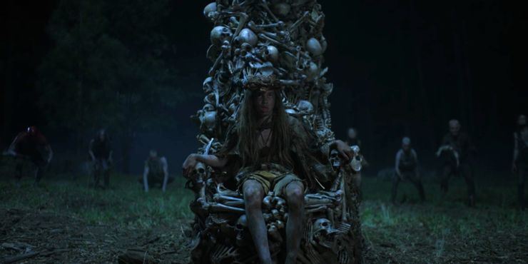 Mantenerse al dia con Historias de terror estadounidenses El emocionante giro final del episodio 5, “Feral” termina con Jay y Addy siendo llevados por Feral Nation a un joven adolescente sentado en medio del bosque en un trono hecho de huesos con una corona de palos. Instantáneamente ven la brújula Boy Scout que Jay le había dado a Jacob al comienzo de Historias de terror estadounidenses‘episodio, deduciendo que de hecho es su hijo. Durante la última década, Feral Nation crió a Jacob para convertirse en lo que es esencialmente su rey, con una silla de esqueletos para reforzar su dedicación.
