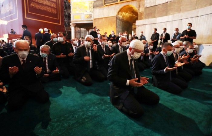 Erdogan y sus principales ministros, usando mascarillas blancas como precaución contra el Covid-19, se arrodillaron sobre alfombras al inicio de la ceremonia que marca el regreso del culto musulmán a la antigua estructura.
