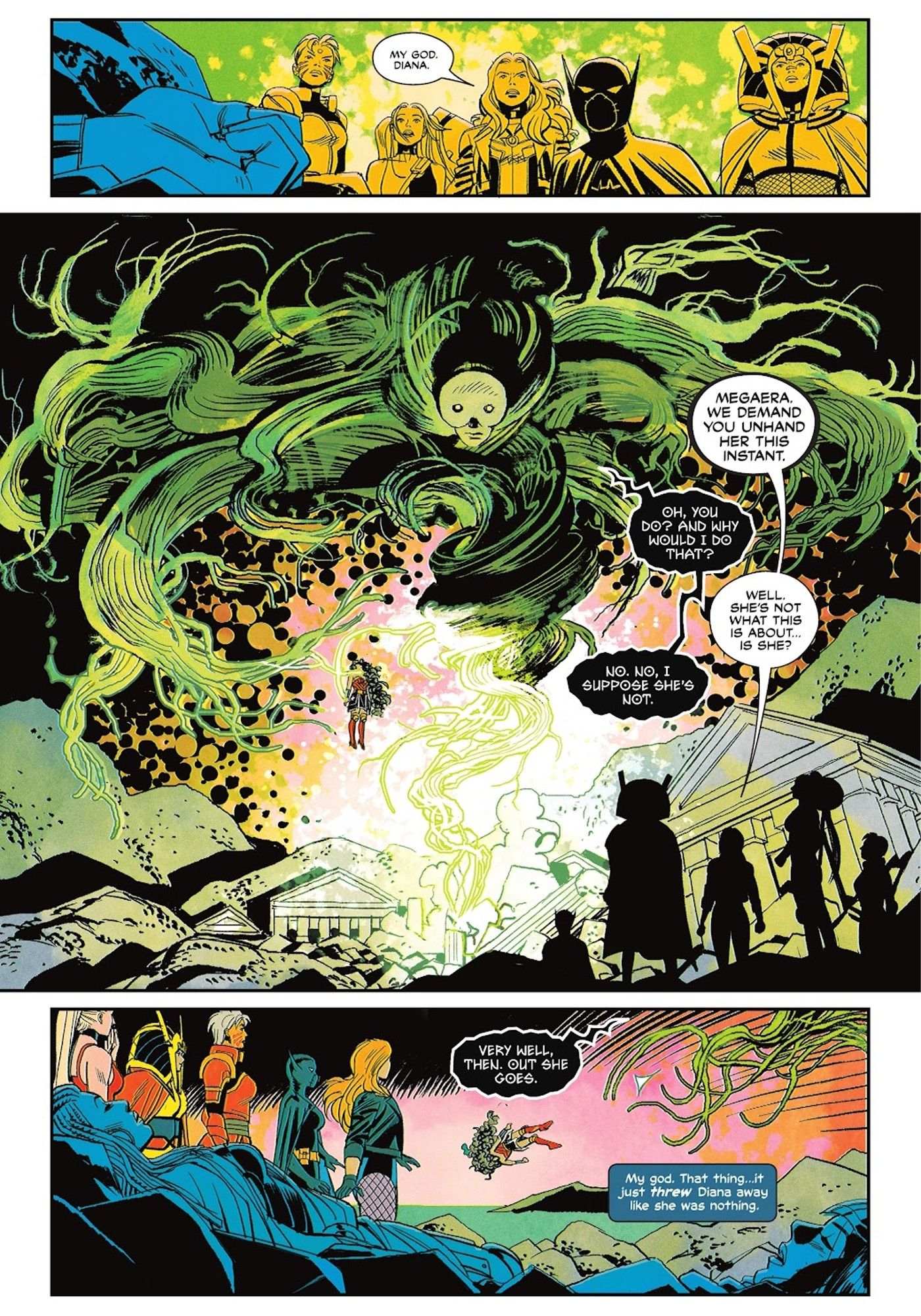 - Megaera, la Diosa de la Venganza, se levanta en Aves de presa #4, que representa una amenaza para Themyscira y las Amazonas, así como para el Universo DC en su conjunto.