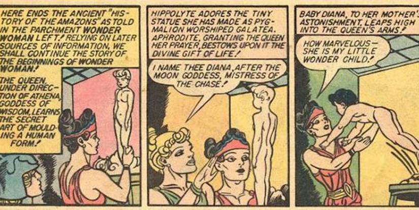 La historia de origen original de Wonder Woman sigue siendo una de las más únicas e icónicas de todos los cómics de DC. En Mujer maravillosa #1 (1942), La reina Hipólica, anhelando a un niño, esculpió a una niña de arcilla y rezó a los dioses griegos para dar vida a su creación. Afrodita respondió su súplica, dando vida a la arcilla, y los dioses otorgaron sabiduría, fuerza, velocidad y belleza de Diana.