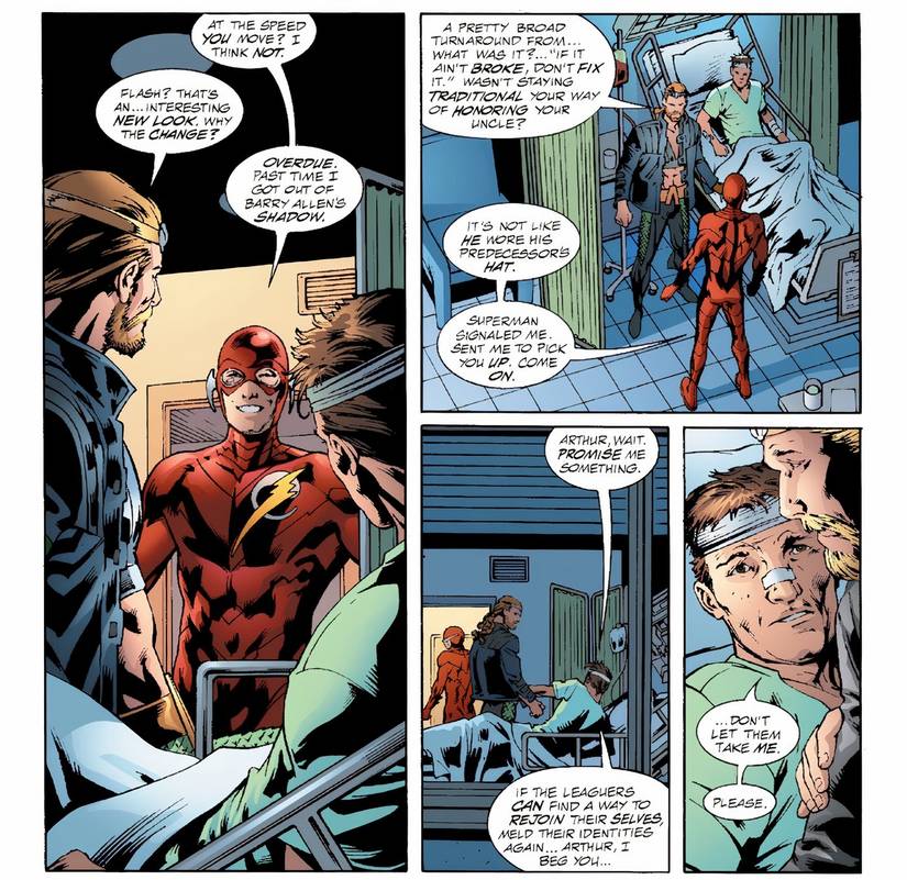 Como reflejo de este cambio, la entidad que ahora opera como Wally West se pone un nuevo uniforme propioactualizando su icónico color escarlata y dorado con un nuevo logo y máscara. Cuando Aquaman cuestiona el cambio de vestuario, Flash responde con desdén: “Atrasado. Pasado el tiempo salí de la sombra de Barry Allen.“