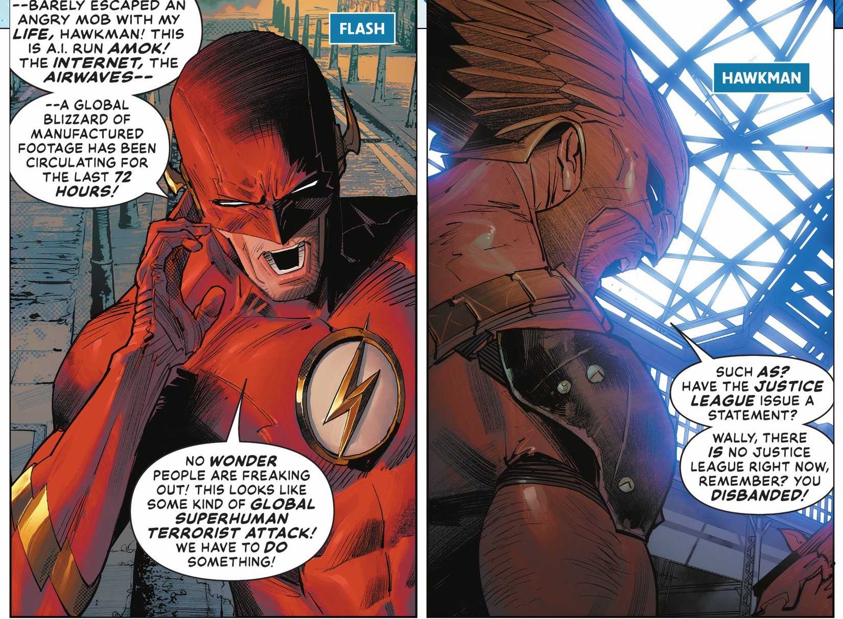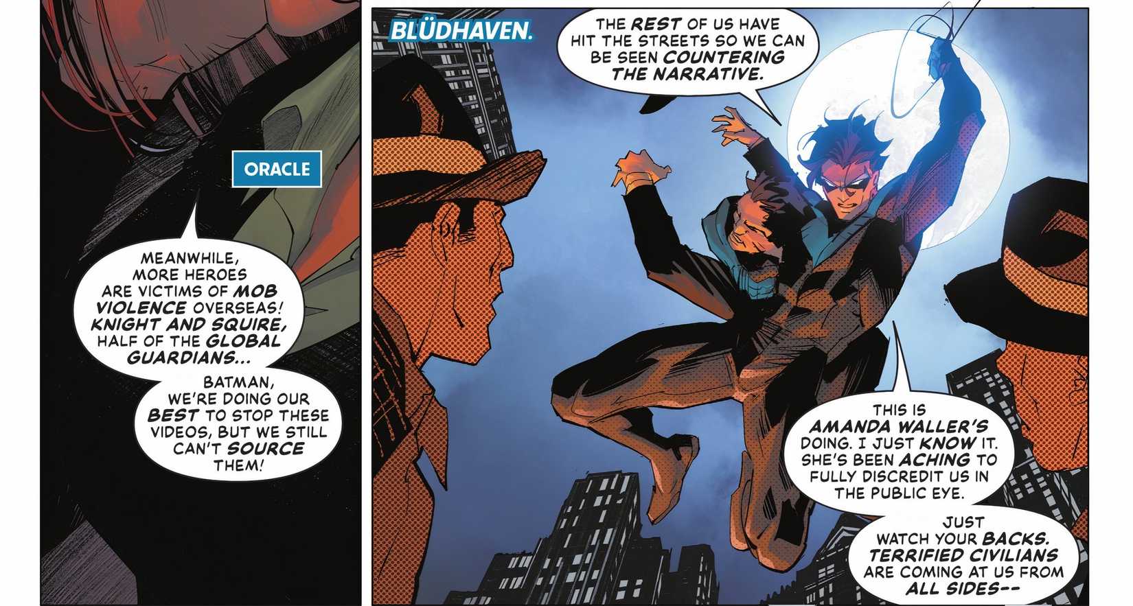 Waller se lanza a por todas con sus imágenes falsas generadas por inteligencia artificial, difundiendo desinformación en todo el mundo y pirateando los principales medios de comunicación para amplificar su narrativa falsa. Estos videos muestran a héroes como Supergirl, Green Lantern, los Titans, Shazam, Firestorm, Superman y otros cometiendo actos de violencia contra inocentes. Como Flash resume con precisión: “¡No me extraña que la gente esté tan asustada! ¡Esto parece una especie de ataque terrorista mundial sobrehumano!” En consecuencia, la gente comienza a tener miedo de sus héroes, que una vez fueron sus amados, y comienza a atacarlos apenas los ve, cayendo sin saberlo en el juego de Waller.