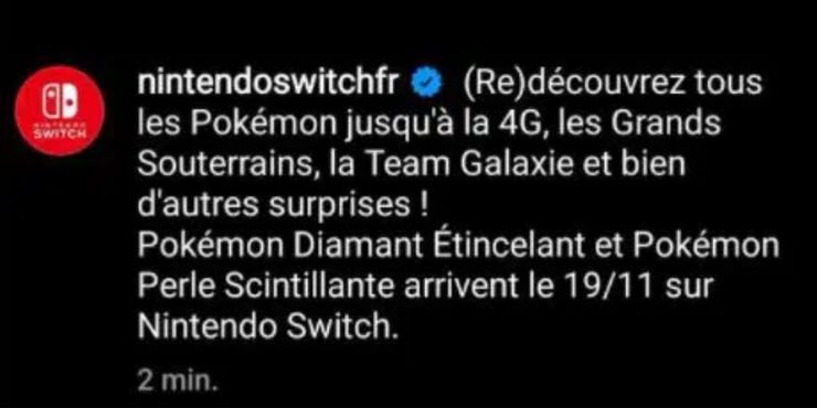 Una declaración oficial de Nintendo de Francia implica que Pokémon Brilliant Diamond y Shining Pearl no contarán con un elenco completo de Pokémon.