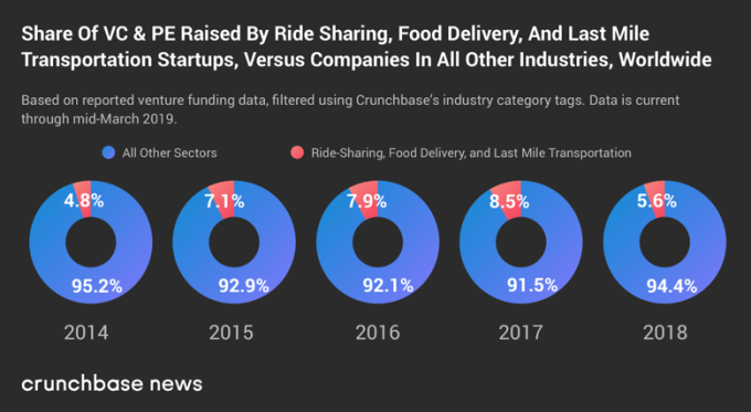 De todo el capital de riesgo inicial, avanzado y de etapa tardía recaudado en los últimos dos años, ¿qué parte del total se destinó a las empresas en las categorías de transporte, entrega de alimentos y transporte de última milla (que incluye bicicletas y scooters)? Probablemente no tanto como piensas.