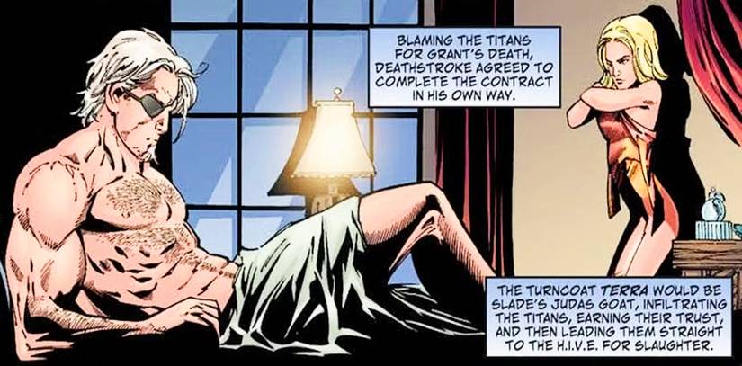 Deathstroke es una figura polarizante, y no simplemente porque es un asesino de alquiler. El universo DC está lleno de villanos que matan por dinero o simplemente para satisfacer una racha sádica. En cambio, la relación física de Slade con el asesino de contratos menores de edad, Terra, siempre será un punto decisivo para el personaje. Terra se convirtió en la figura central en su plan de venganza para regresar a los titanes adolescentes, aún culpándolos por la muerte de su hijo, Grant Wilson (Ravager). Estaba destinada a infiltrarse en el equipo, traicionarlos a Slade, y esencialmente tomaría el asunto en sus propias manos desde allí.