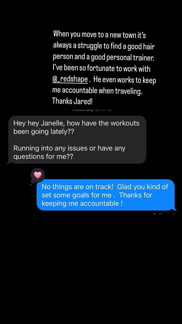 En una historia de Instagram Janelle escribió, “Cuando te mudas a una nueva ciudad, siempre es una lucha encontrar una buena persona del cabello y un buen entrenador personal”. Expresó su aprecio por encontrar un entrenador personal, Jared Akersquien la ha ayudado a alcanzar sus objetivos de fitness y la mantuvo en el camino incluso durante sus viajes.