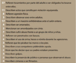 En seis escuelas, los niños y niñas refieren presenciar actos sexuales entre los adultos que participan en la agresión. En 7 escuelas, las víctimas narran ser obligadas a realizarse tocamientos entre los propios niños y niñas.