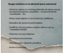 Los pequeños son puestos en situaciones de extremo conflicto emocional y moral. Así como en los casos litigados por ODI los niños y niñas entran en conflicto al ser obligados a lastimar a un compañero o compañera, u observar que sus amigos/as sufren sin poder ayudarlos, los casos documentados en Israel incorporan elementos religiosos en la violencia psicológica ejercida. Tratándose de escuelas ortodoxas, en donde los niños y niñas han sido educados dentro de estrictos cánones de comportamiento, las víctimas refieren ser obligadas a trasgredir las normas religiosas de su comunidad. Al igual que los casos antes descritos, los agresores utilizan elementos grotescos como heces u orina. Se reitera el patrón de que los niños y niñas son sacados de la escuela, que reportan ser fotografiados y hay indicadores de que algunos son sedados. Entre los rasgos similares, se observa que en los casos de Jerusalén algunos niños y niñas presentan confusión sobre si sus padres son o no sus verdaderos progenitores.