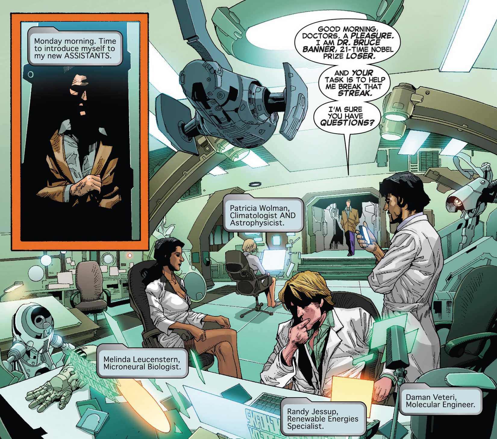 En Indestructible Hulk #4 (2013) – Mark Waid, Leinil Yu y Gerry Alanguilan – Bruce Banner ha sido concedido un laboratorio y personal totalmente financiados por Shield Con la promesa de que cuando Shield necesita un Hulk, obtendrán uno.