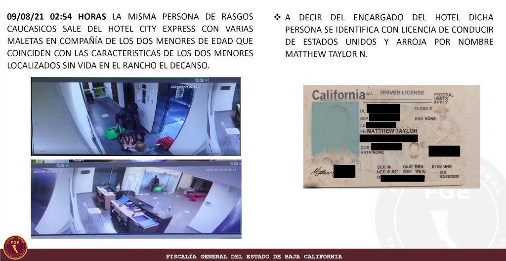 La fiscalía informó que el sospechoso fue captado por las cámaras de seguridad cuando llegó con sus dos hijos al Hotel City Express, carretera Libre Tijuana – Ensenada 362, Colonia Reforma, Rosarito. El hombre cuyo apellido, no ha sido revelado por las autoridades mexicanas, llegó sin reservación y pagó por una noche.