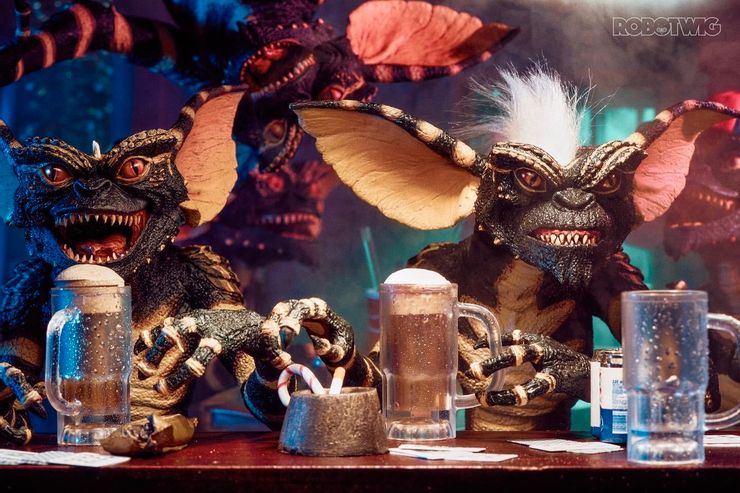 La imagen de juguete es increíblemente detallada e incluso presenta gotas de condensación en el exterior de los vasos de cerveza de los Gremlins y un bastón de caramelo en el cenicero. La iluminación de la imagen también recuerda mucho a la película original de Gremlins, capturando el interior oscuro pero dramáticamente iluminado de Dorry’s Tavern. Una imagen detrás de escena dentro de la misma publicación muestra la misma escena pero desde un ángulo diferente, mostrando hasta dónde llegó Robotwig para recrear fielmente la atmósfera de la película original.