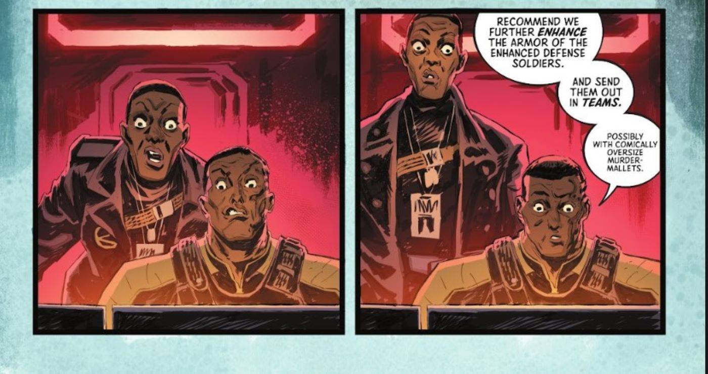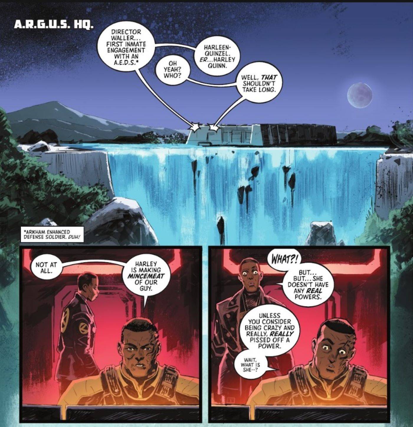 Sin que ella lo sepa, Waller y Flag siguen de cerca su progreso. Waller se sorprende al ver a Harley defendiéndose de los guardias equipados con súper trajes, dada su falta de “poderes reales.” Sin embargo, Flag señala los verdaderos superpoderes de Harley–”…estar loco y muy, muy enojado.“
