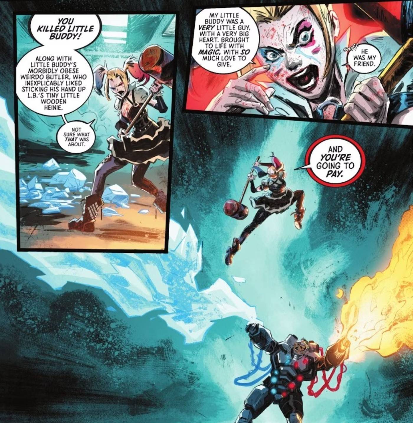 Si bien el comentario de Flag puede parecer gracioso, en realidad subraya un aspecto importante de la destreza de combate de Harley que trasciende las capacidades humanas comunes. Las emociones y la fuerza física están estrechamente vinculadas, como lo demuestran las anécdotas de madres que muestran extraordinarias hazañas de fuerza, como levantar automóviles, en momentos de estrés extremo para proteger a sus hijos. Similarmente, Harley, impulsada por emociones intensas, opera de una manera que le permite lograr hazañas sobrehumanas.. Por lo tanto, la capacidad de Harley para emociones extremas y la alta frecuencia con la que experimenta dichas emociones intensas, particularmente cuando está “realmente, realmente enojado,” la dota de habilidades sobrehumanas similares a superpoderes.