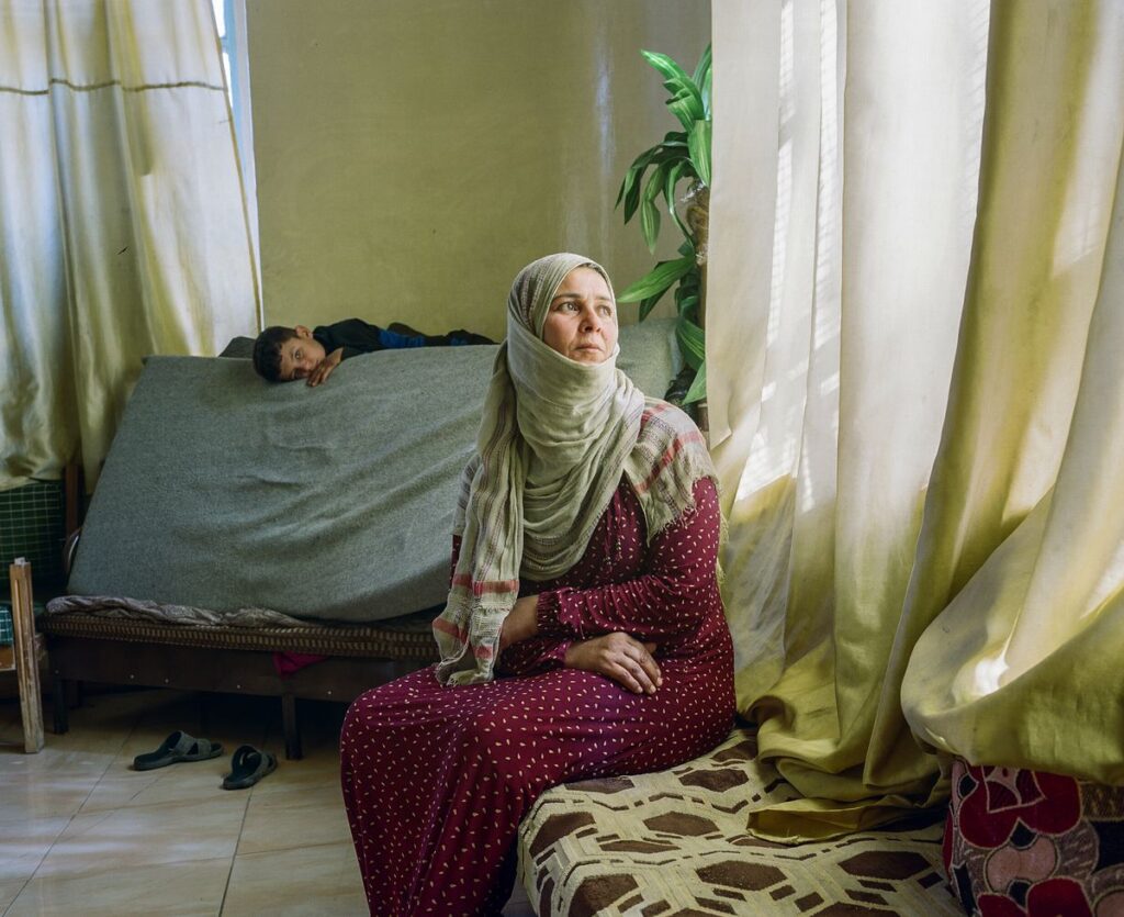 Los pupitres de lo que antes era un aula y donde ahora vive Riham sirven a su madre para cambiarle los pañales a su hermano pequeño. La pizarra se ha convertido en un perchero, y unas cuantas ollas cuelgan de los clavos de la parte superior. La mesa en la que antes solía sentarse el profesor es la que utiliza la familia para guardar la mayoría de los utensilios, mientras que ellos se sientan en el suelo para comer. Los pupitres se desplazan a un lado de la habitación, donde se colocan los colchones durante el día. Por la noche, la familia duerme en esos mismos jergones, puestos en el suelo.